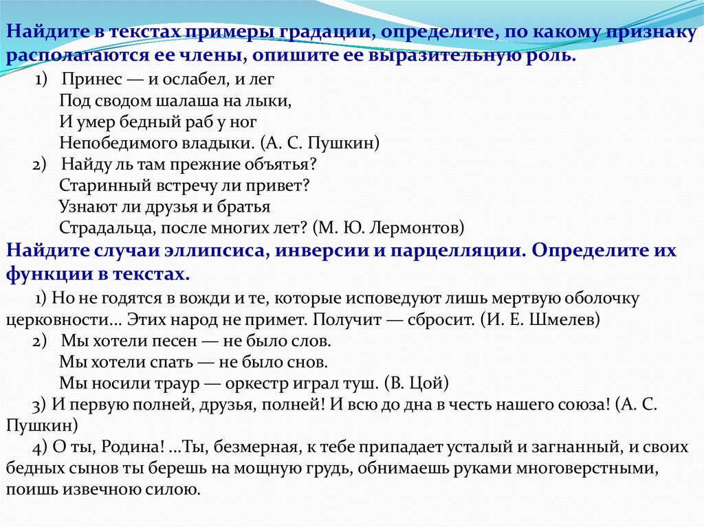 Найдите в текстах примеры градации, определите, по какому признакурасполагаются ее члены, опишите ее выразительную роль.