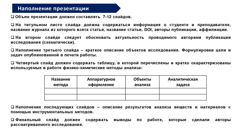 Наполнение презентацииОбъем презентации должен составлять 7-12 слайдов.