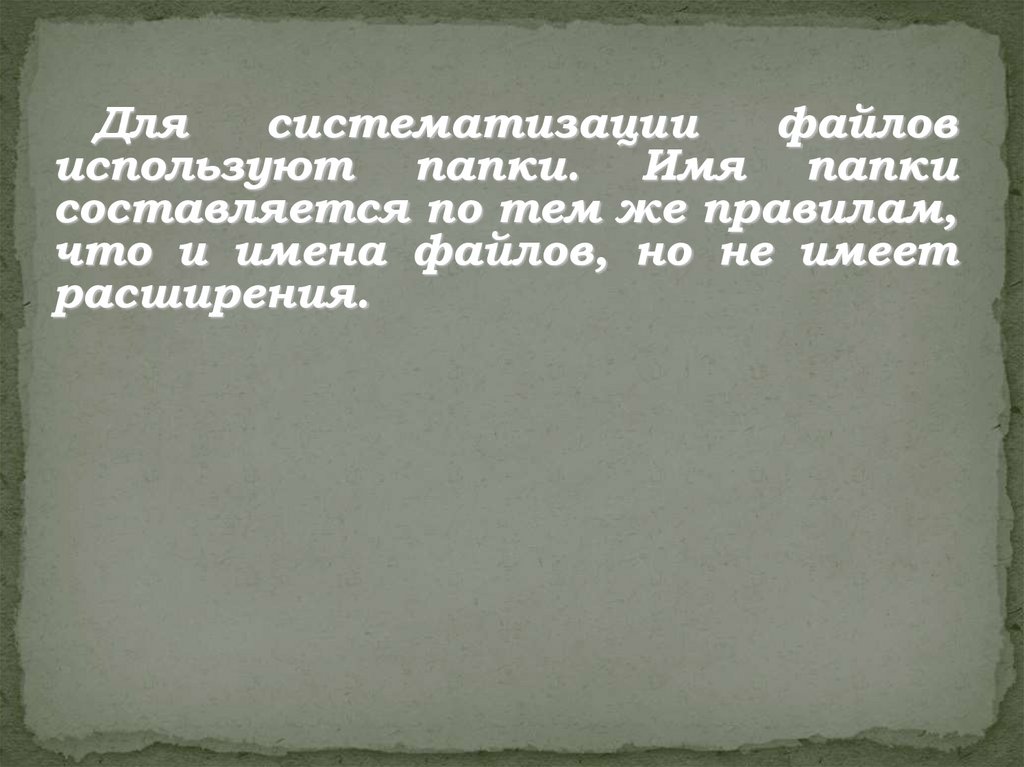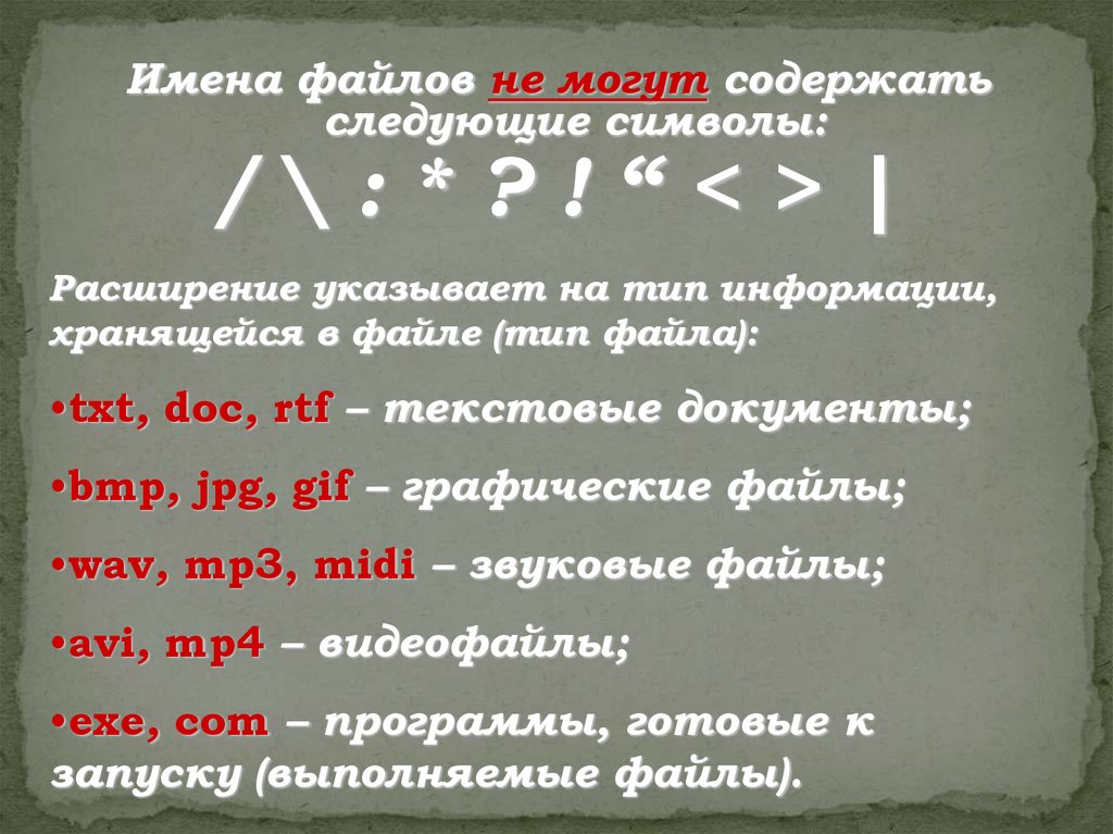 Имя файла состоит из 2х частей:1) имя – дает файлу пользователь –