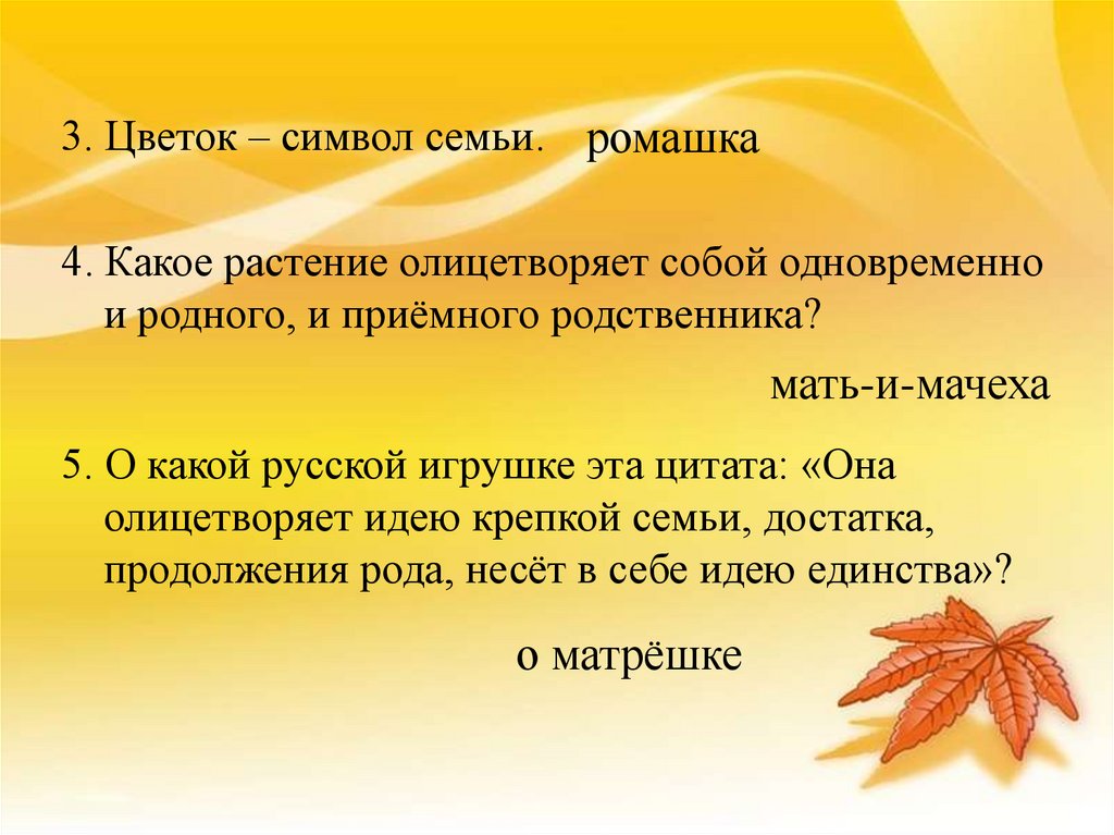 3. Цветок – символ семьи. ромашка4. Какое растение олицетворяет собой одновременно