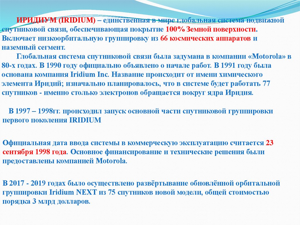 ИРИДИУМ (IRIDIUM) – единственная в мире глобальная система подвижнойспутниковой связи, обеспечивающая покрытие 100% Земной поверхности.