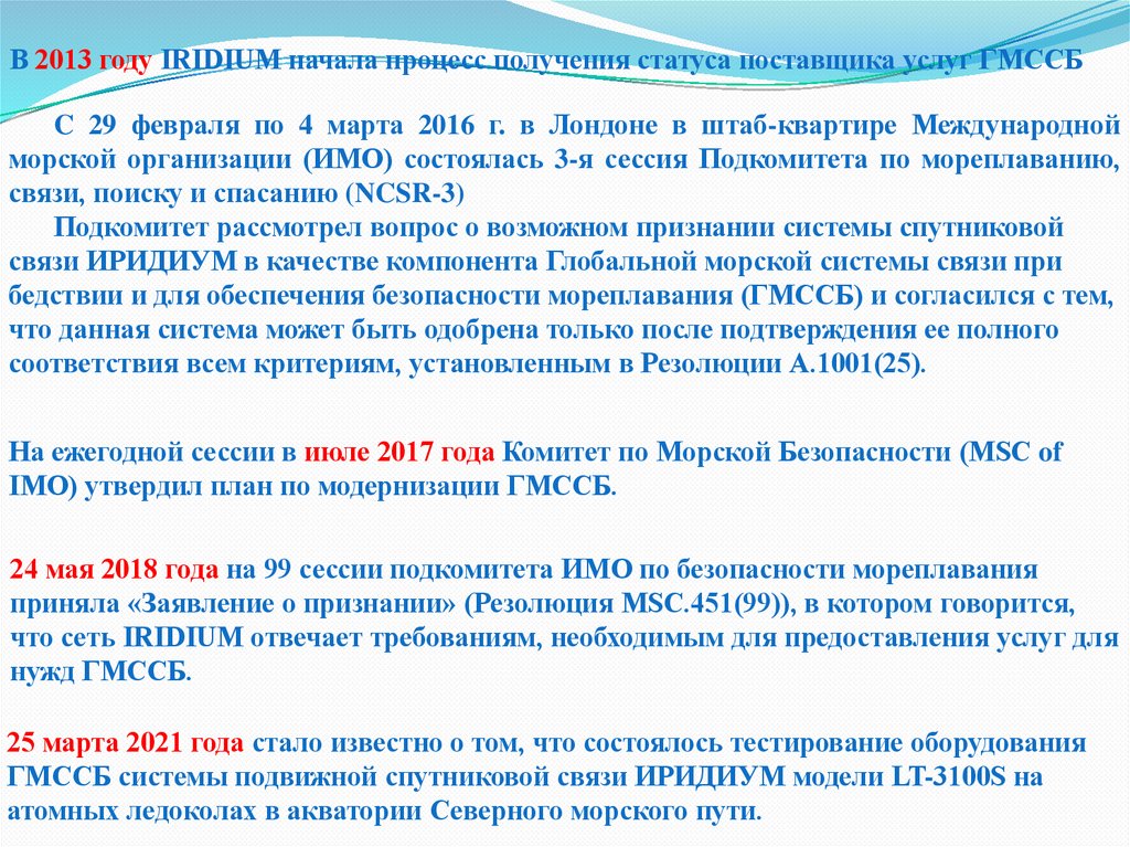 Решение Международной Морской Организации признать ИРИДИУМ вторым