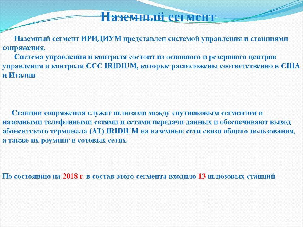 Наземный сегментНаземный сегмент ИРИДИУМ представлен системой управления и станциями