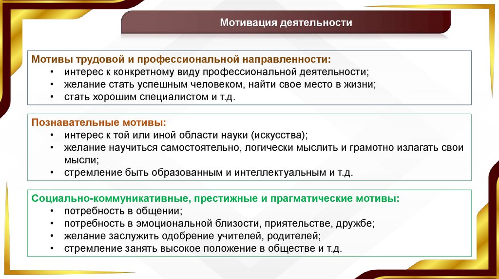 Мотивация деятельностиМотивы трудовой и профессиональной направленности: