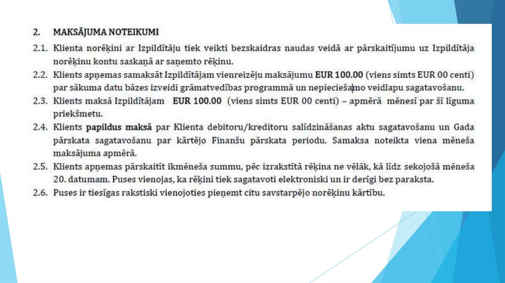 Līgumā parasti tiek norādīta cena par precēm vaipakalpojumiem, maksājuma termiņi, maksājuma