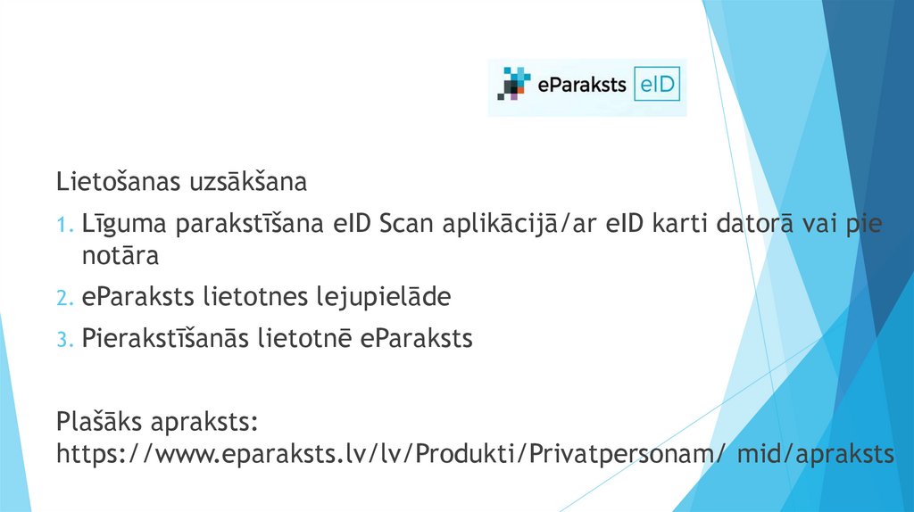 Lietošanas uzsākšana1. Līguma parakstīšana eID Scan aplikācijā/ar eID karti datorā vai pie
