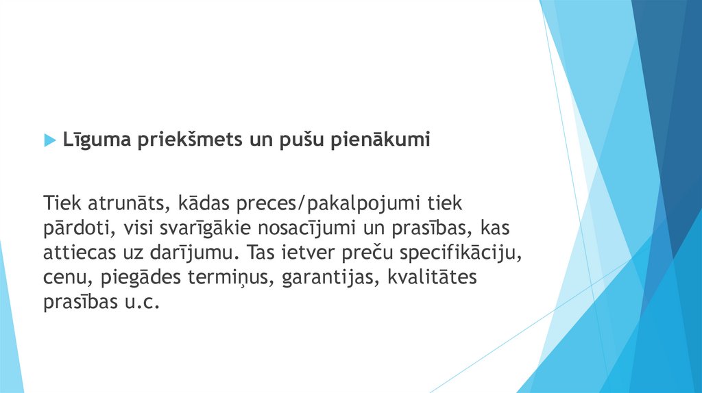 Līguma priekšmets un pušu pienākumiTiek atrunāts, kādas preces/pakalpojumi tiek