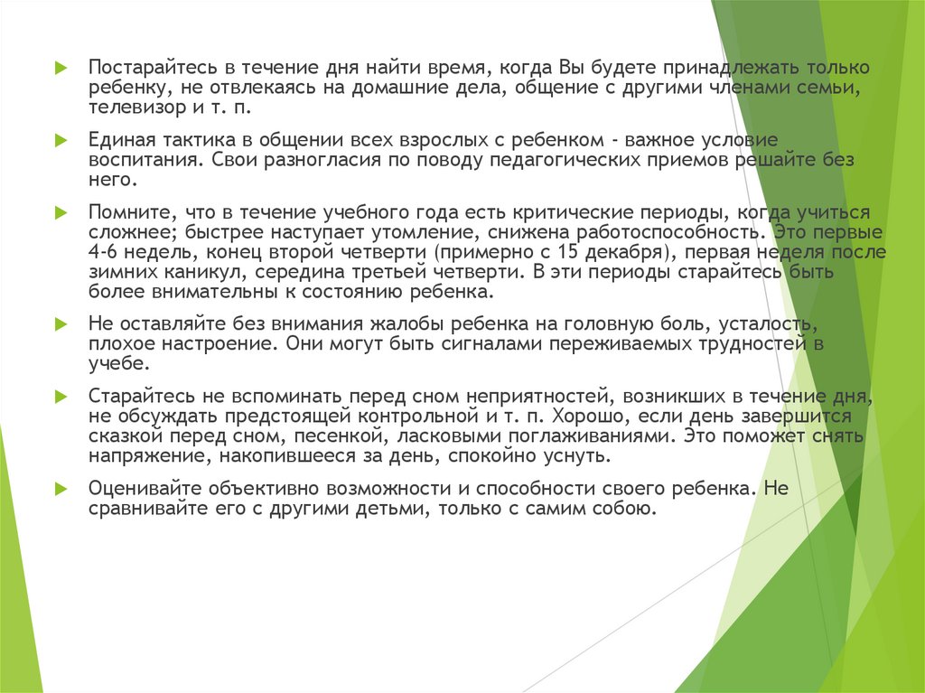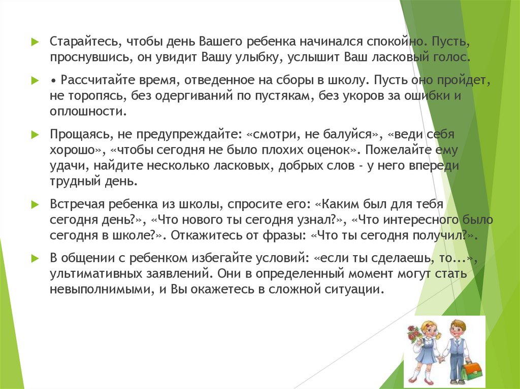 не обсуждать предстоящей контрольной и т. п. Хорошо, если день завершится