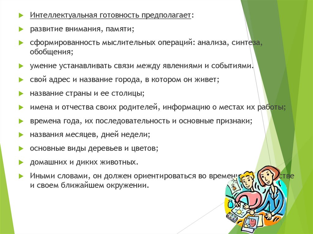 Интеллектуальная готовность предполагает:развитие внимания, памяти;