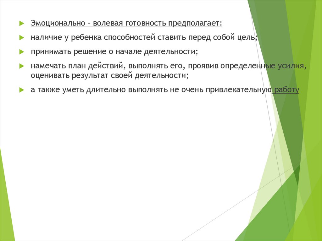 Эмоционально – волевая готовность предполагает:наличие у ребенка способностей ставить перед собой цель;