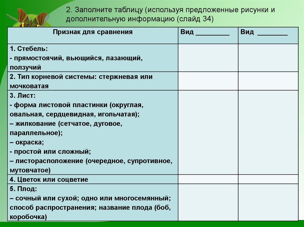 2. Заполните таблицу (используя предложенные рисунки идополнительную информацию (слайд 34)