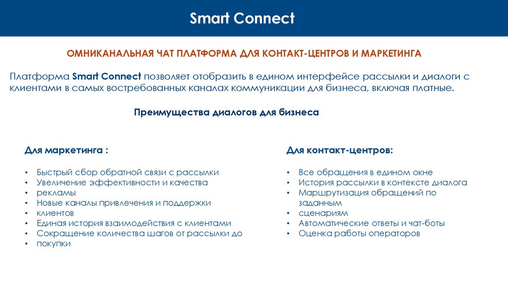 Smart ConnectОМНИКАНАЛЬНАЯ ЧАТ ПЛАТФОРМА ДЛЯ КОНТАКТ-ЦЕНТРОВ И МАРКЕТИНГА