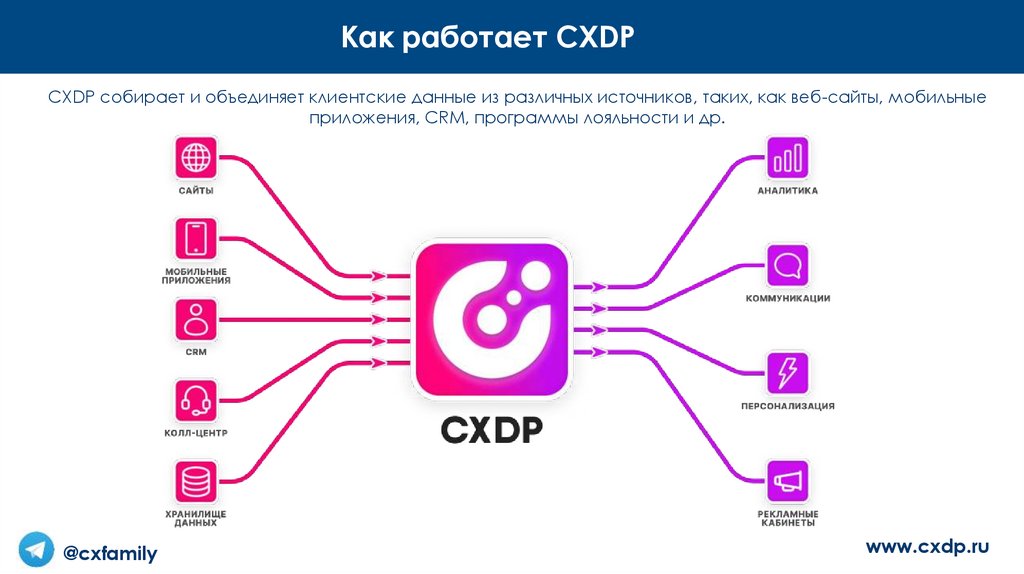 Как работает CXDPCXDP собирает и объединяет клиентские данные из различных источников, таких, как веб-сайты, мобильные