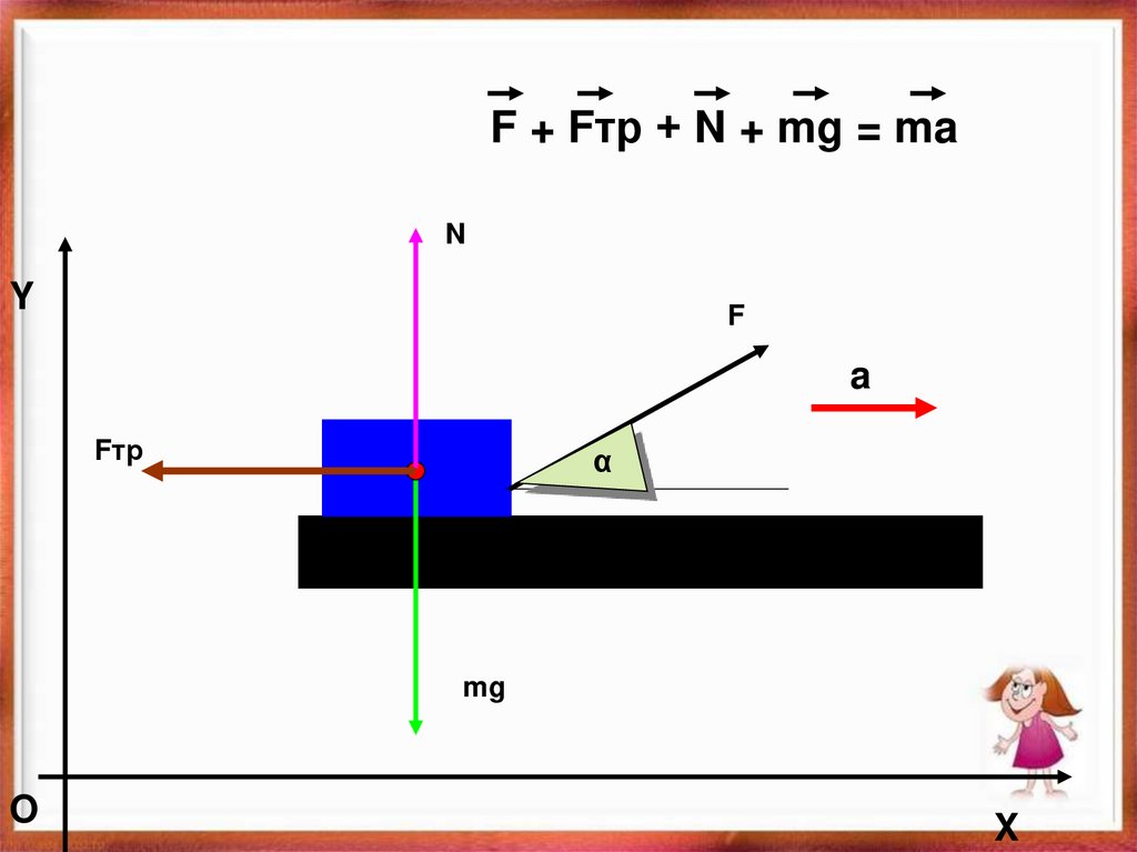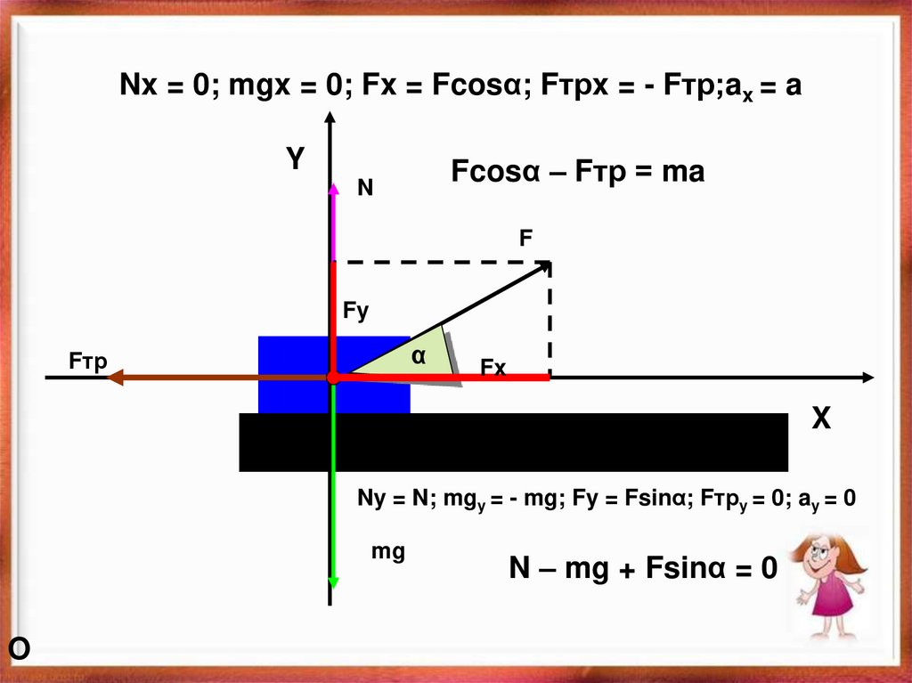 Nx = 0; mgx = 0; Fx = Fcosα; Fтрx = - Fтр;ax = aY