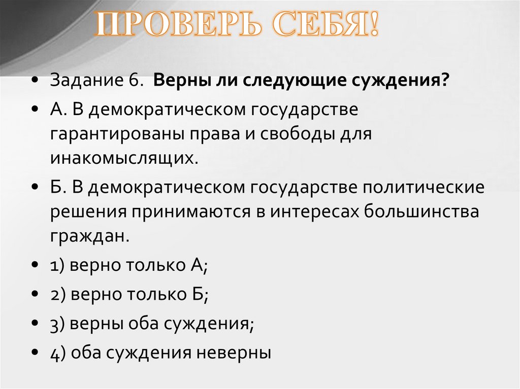 • Задание 6. Верны ли следующие суждения?• А. В демократическом государстве