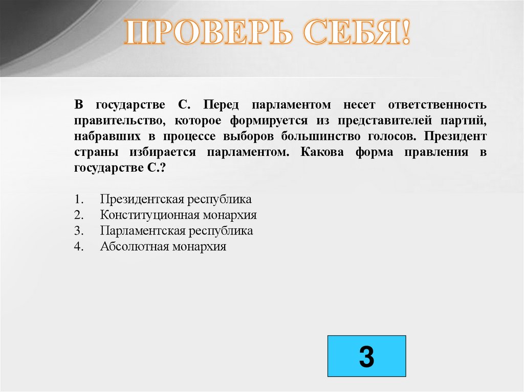 В государстве С. Перед парламентом несет ответственностьправительство, которое формируется из представителей партий,