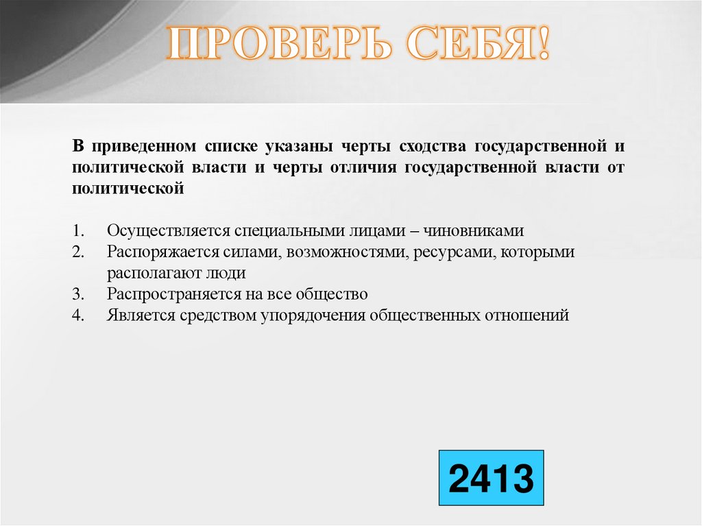 В приведенном списке указаны черты сходства государственной иполитической власти и черты отличия государственной власти от