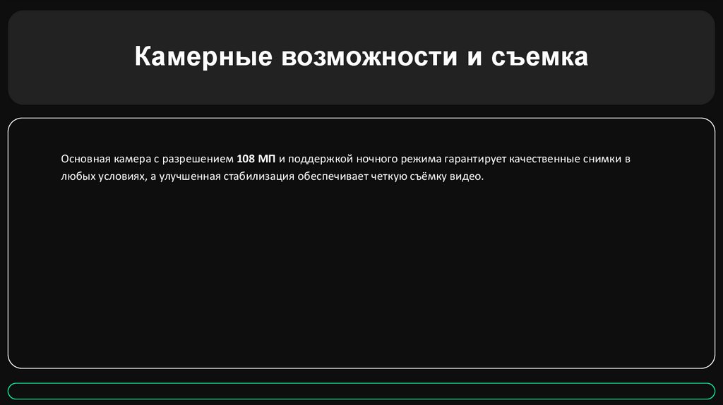 Камерные возможности и съемкаОсновная камера с разрешением 108 МП и поддержкой ночного режима гарантирует качественные снимки в