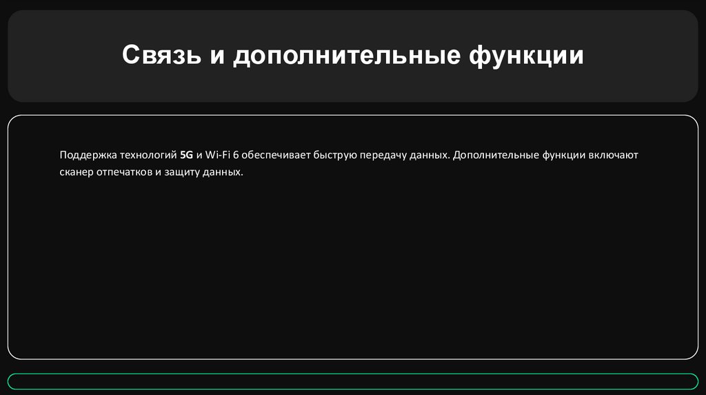 Связь и дополнительные функцииПоддержка технологий 5G и Wi-Fi 6 обеспечивает быструю передачу данных. Дополнительные функции включают