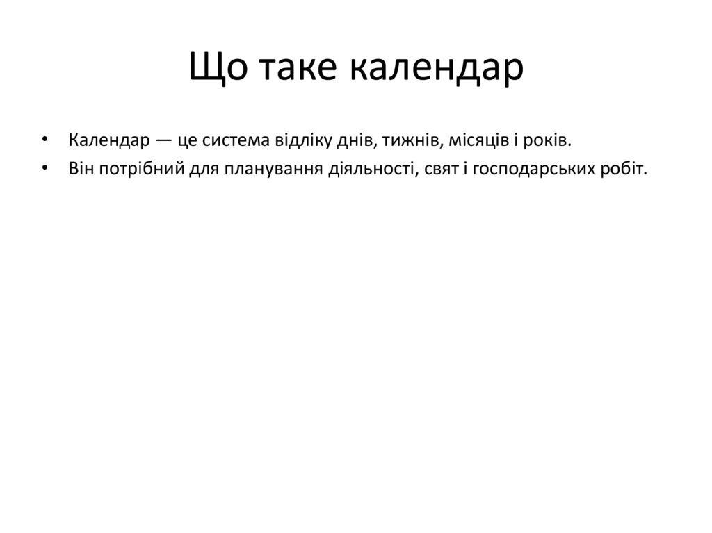 Що таке календар• Календар — це система відліку днів, тижнів, місяців і років.