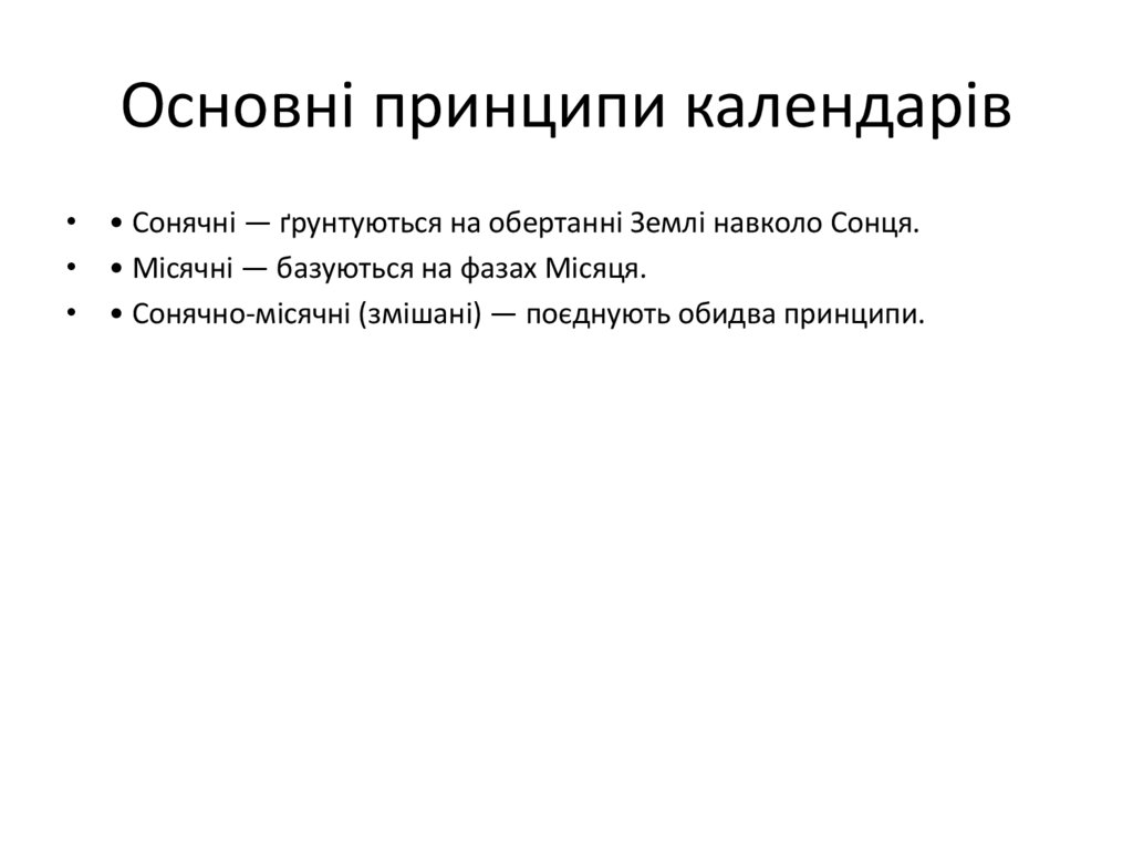 Основні принципи календарів• • Сонячні — ґрунтуються на обертанні Землі навколо Сонця.