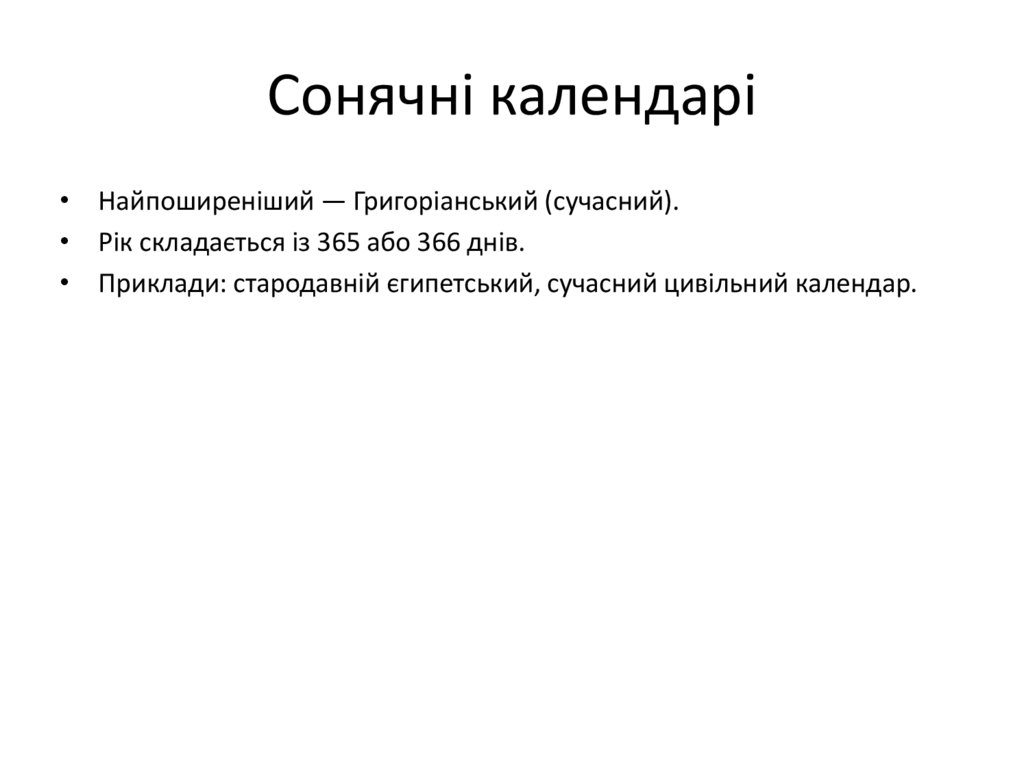 • Приклади: стародавній єгипетський, сучасний цивільний календар.