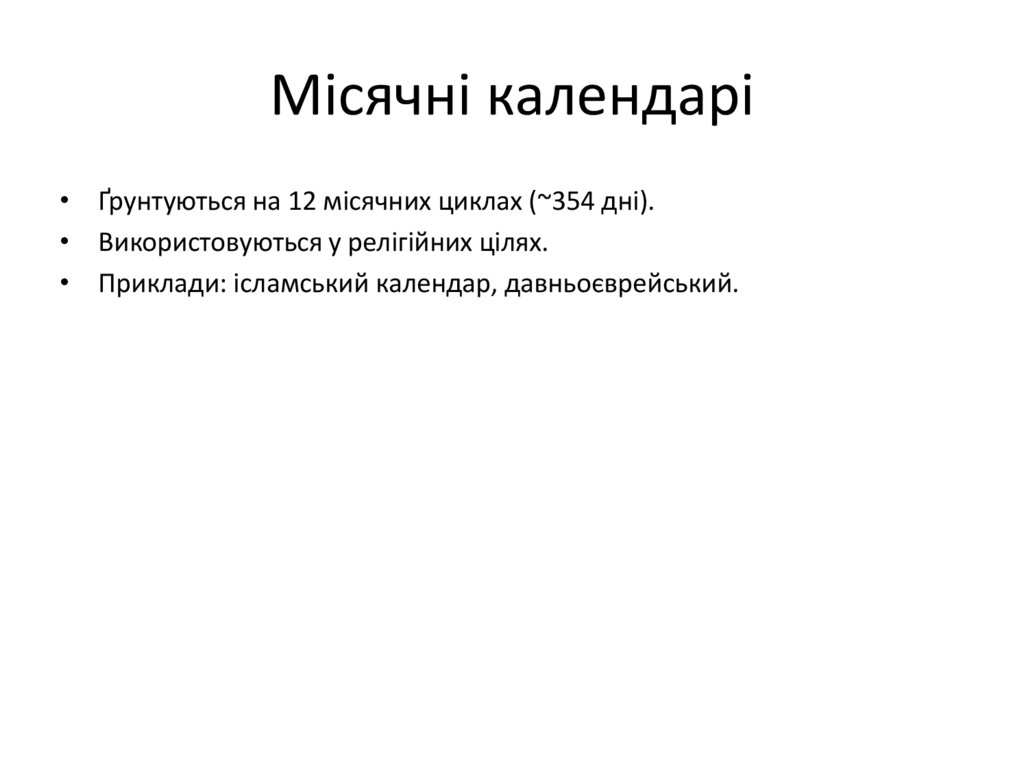 Місячні календарі• Ґрунтуються на 12 місячних циклах (~354 дні).