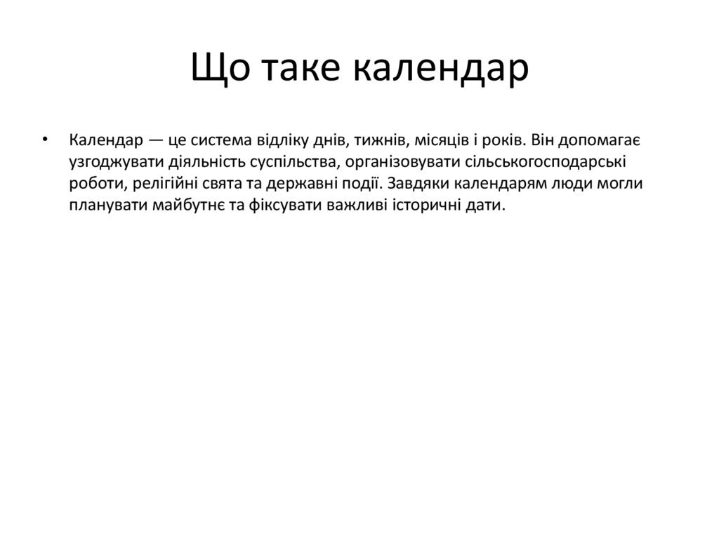 Що таке календарКалендар — це система відліку днів, тижнів, місяців і років. Він допомагає