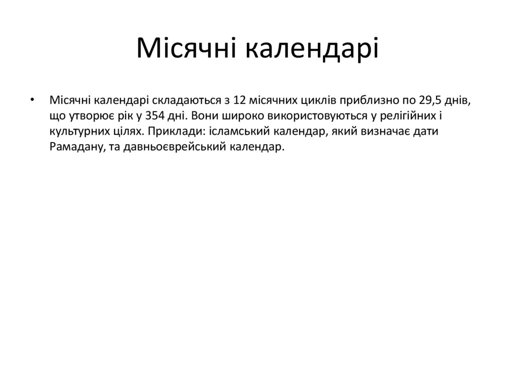 Місячні календаріМісячні календарі складаються з 12 місячних циклів приблизно по 29,5 днів,