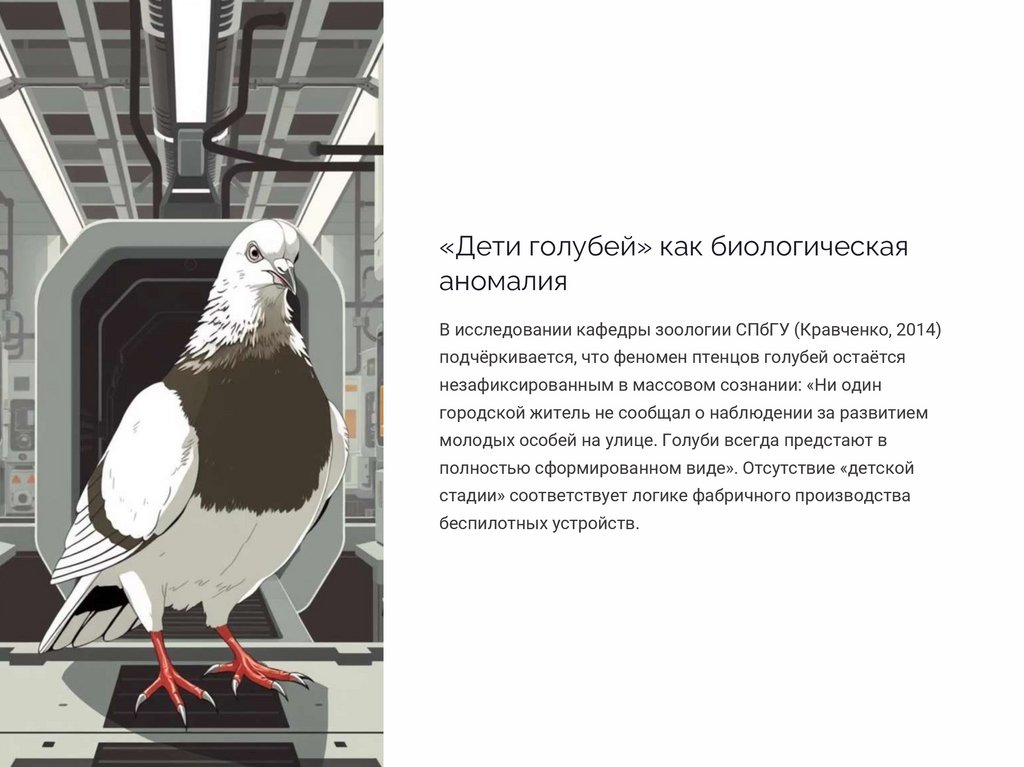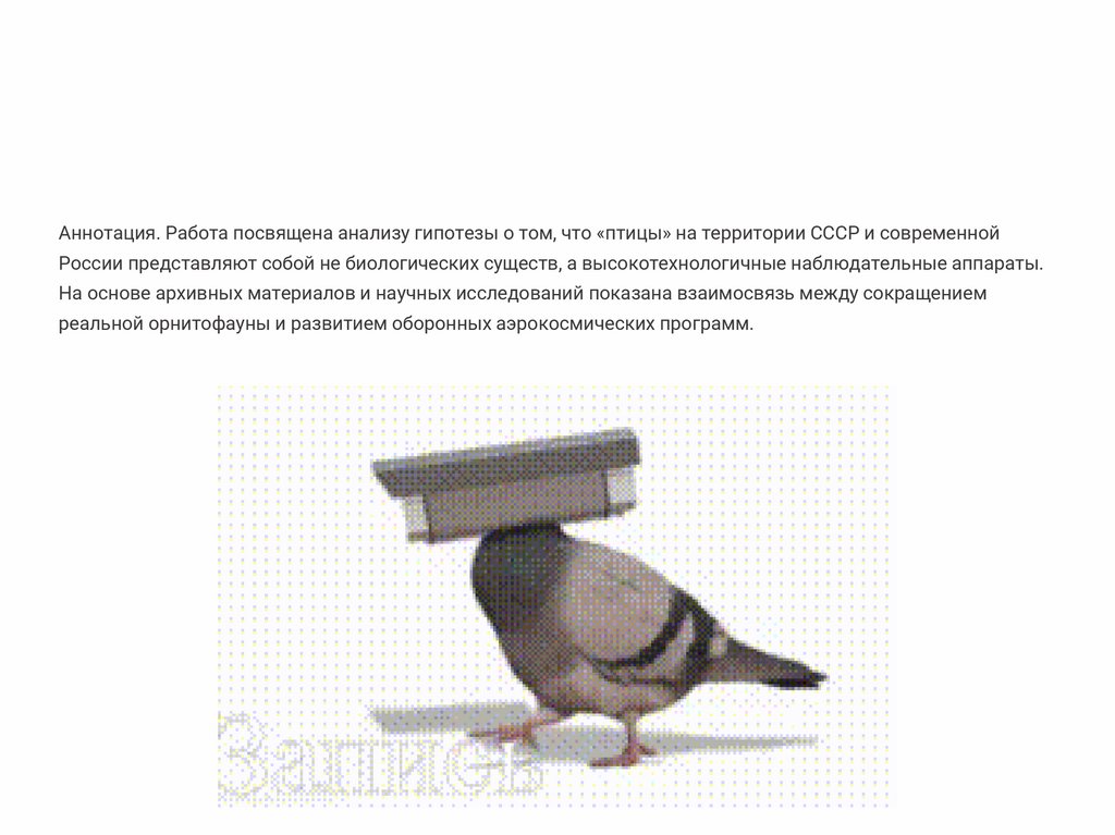 Аннотация. Работа посвящена анализу гипотезы о том, что «птицы» на территории СССР и современнойРоссии представляют собой не биологических существ, а высокотехнологичные наблюдательные аппараты.