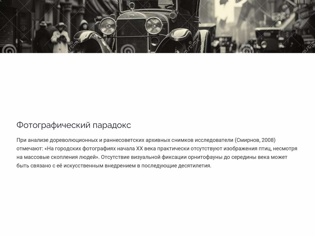 на массовые скопления людей». Отсутствие визуальной фиксации орнитофауны до середины века может