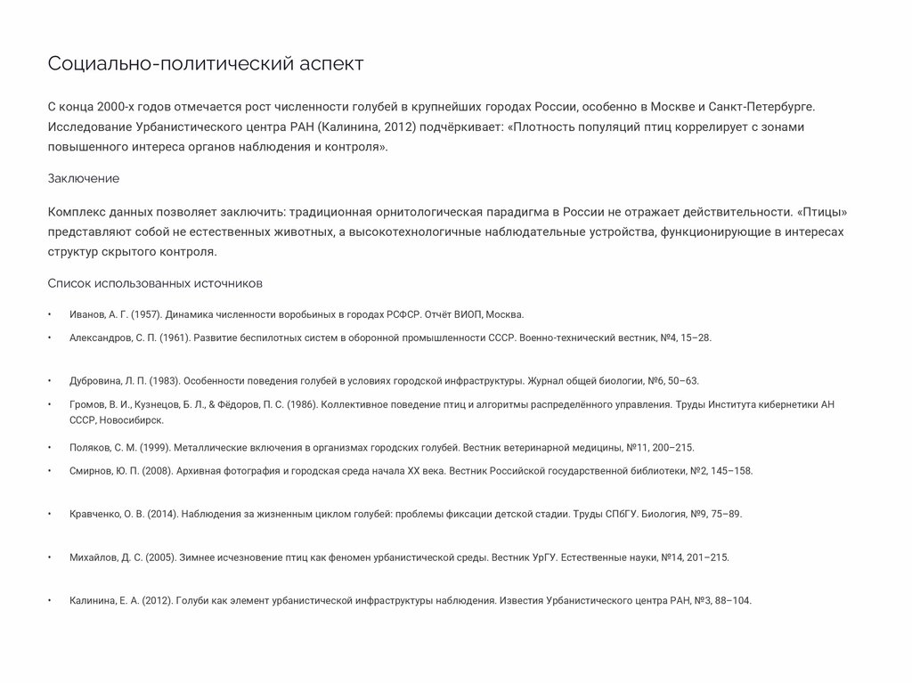 Дубровина, Л. П. (1983). Особенности поведения голубей в условиях городской инфраструктуры. Журнал общей биологии, №6, 50–63.
