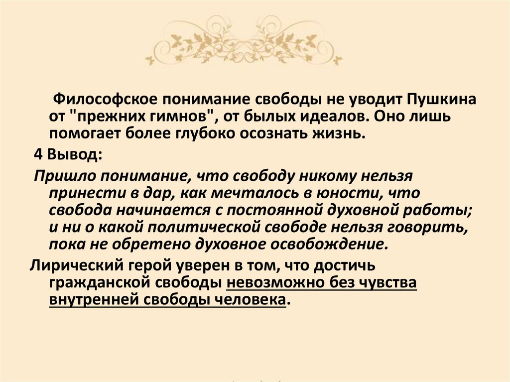 Философское понимание свободы не уводит Пушкинаот "прежних гимнов", от былых идеалов. Оно лишь