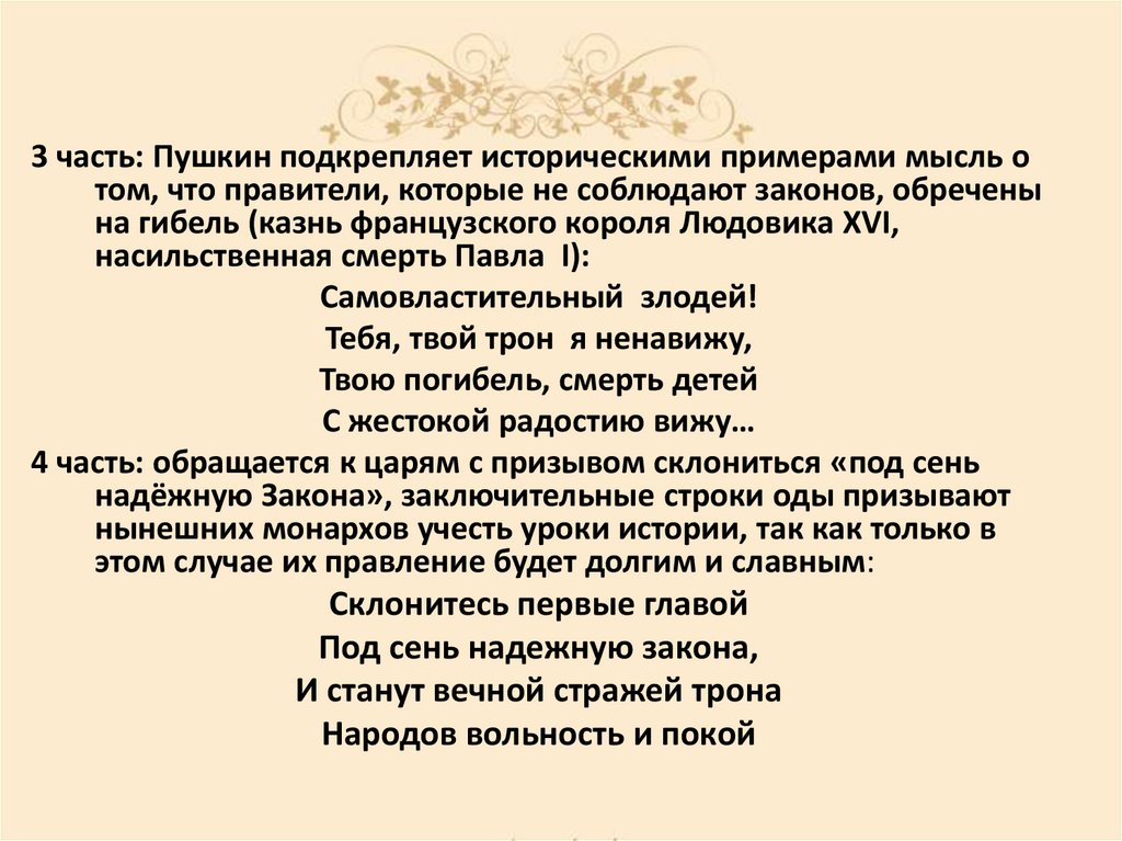 3 часть: Пушкин подкрепляет историческими примерами мысль отом, что правители, которые не соблюдают законов, обречены