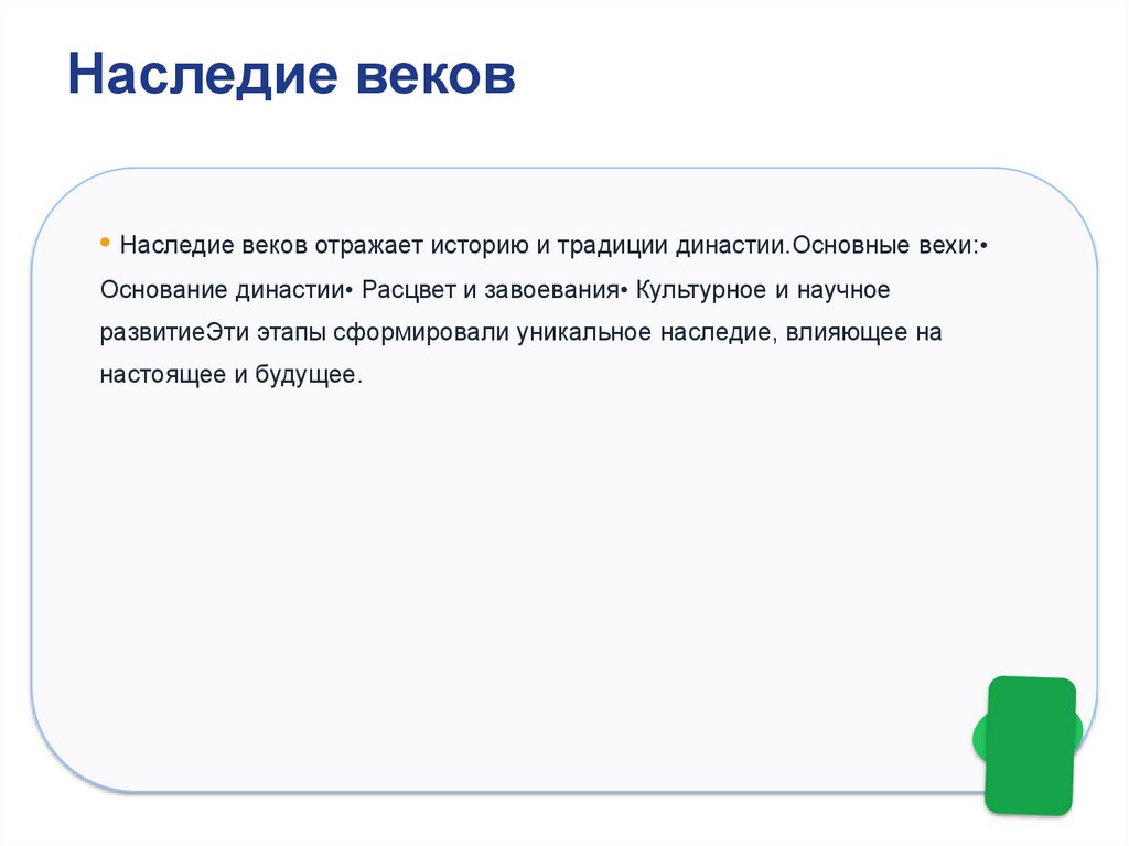 Наследие веков• Наследие веков отражает историю и традиции династии.Основные вехи: