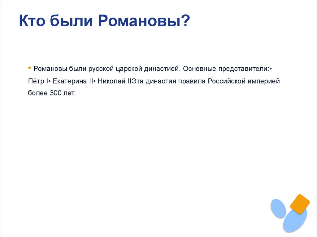 Кто были Романовы?• Романовы были русской царской династией. Основные представители: