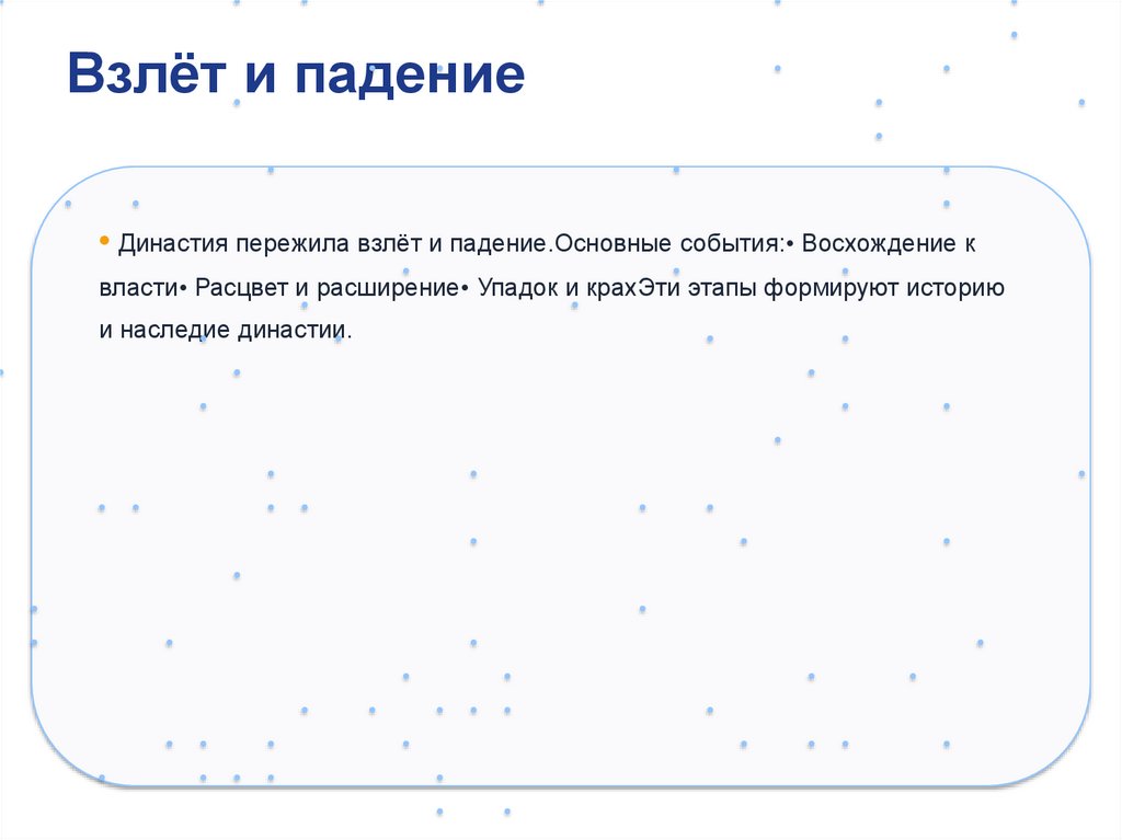 Взлёт и падение• Династия пережила взлёт и падение.Основные события:• Восхождение к