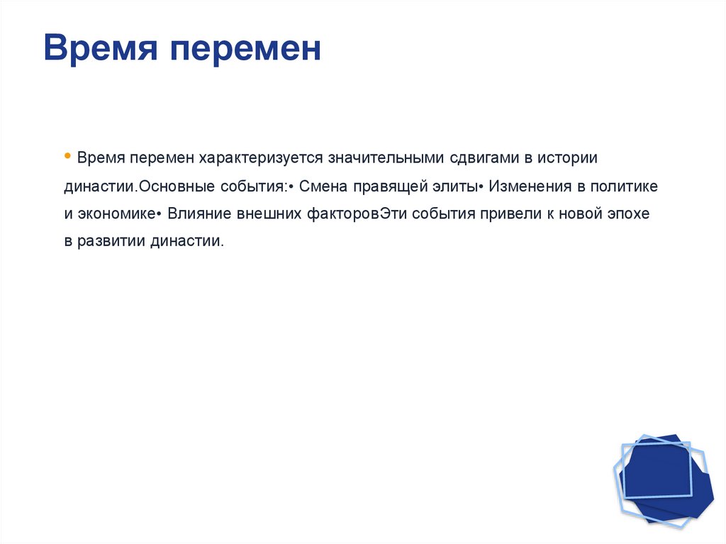 династии.Основные события:• Смена правящей элиты• Изменения в политике