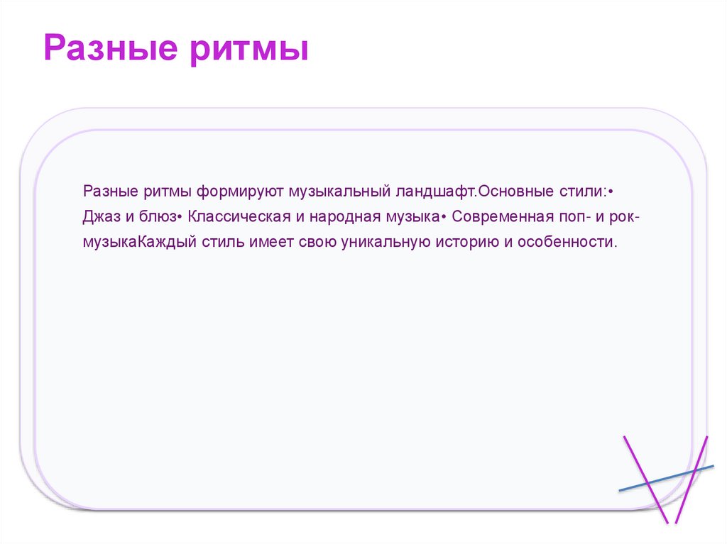 Разные ритмыРазные ритмы формируют музыкальный ландшафт.Основные стили: