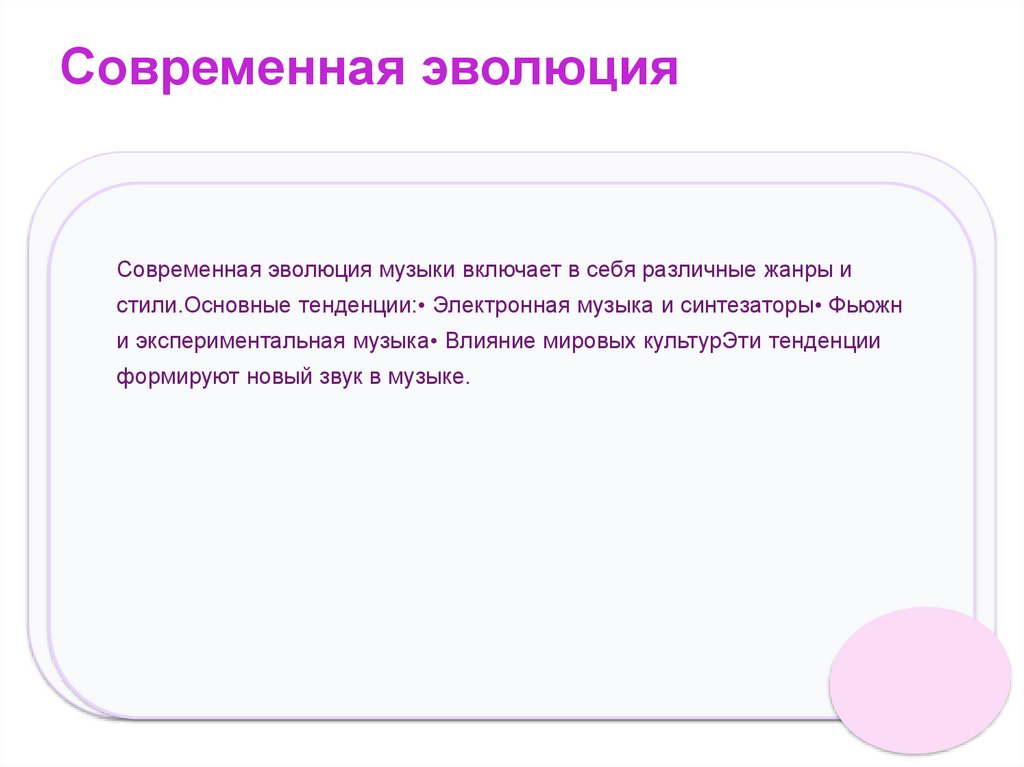 Современная эволюцияСовременная эволюция музыки включает в себя различные жанры и