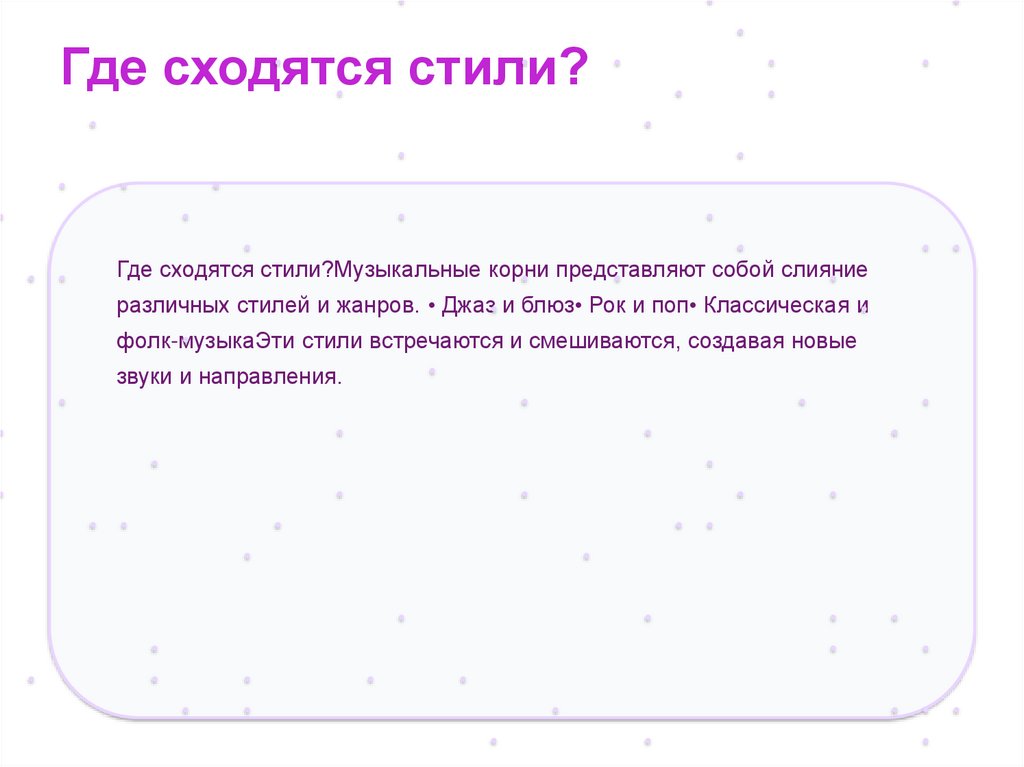 Где сходятся стили?Где сходятся стили?Музыкальные корни представляют собой слияние
