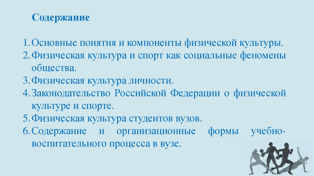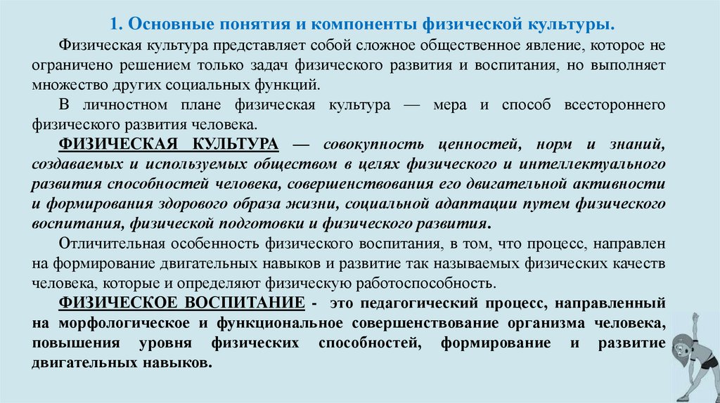 1. Основные понятия и компоненты физической культуры.Физическая культура представляет собой сложное общественное явление, которое не