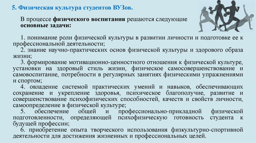 6. Перечислите основные задачи физического воспитания студентов ВУЗов?
