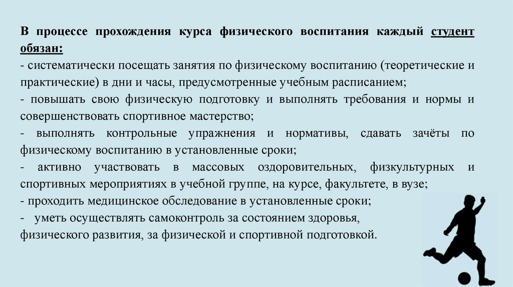 В процессе прохождения курса физического воспитания каждый студентобязан: