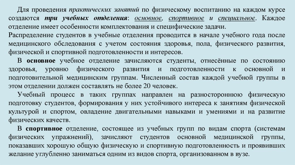 Для проведения практических занятий по физическому воспитанию на каждом курсесоздаются три учебных отделения: основное, спортивное и специальное. Каждое