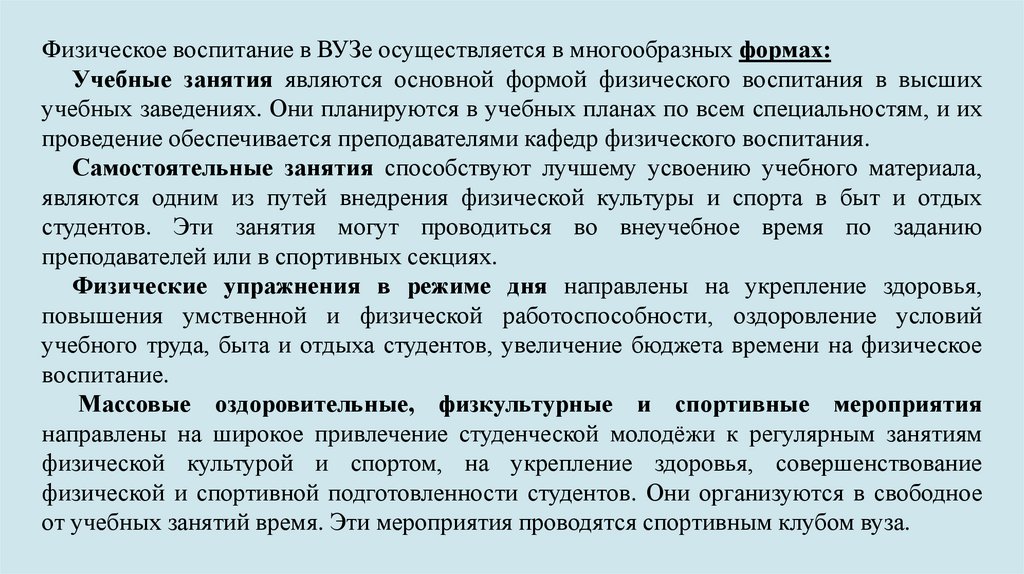 Физическое воспитание в ВУЗе осуществляется в многообразных формах:Учебные занятия являются основной формой физического воспитания в высших