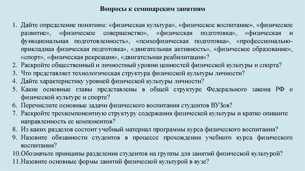 Вопросы к семинарским занятиям1. Дайте определение понятиям: «физическая культура», «физическое воспитание», «физическое