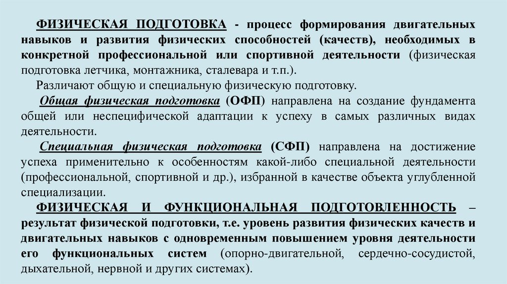 ФИЗИЧЕСКАЯ ПОДГОТОВКА - процесс формирования двигательныхнавыков и развития физических способностей (качеств), необходимых в
