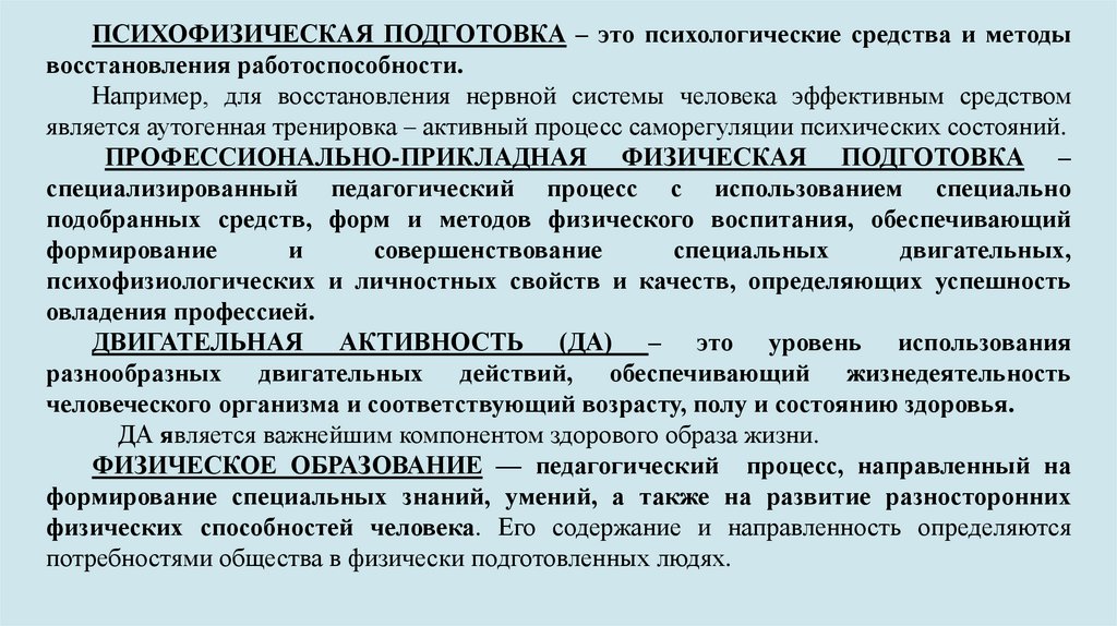 ПСИХОФИЗИЧЕСКАЯ ПОДГОТОВКА – это психологические средства и методывосстановления работоспособности.