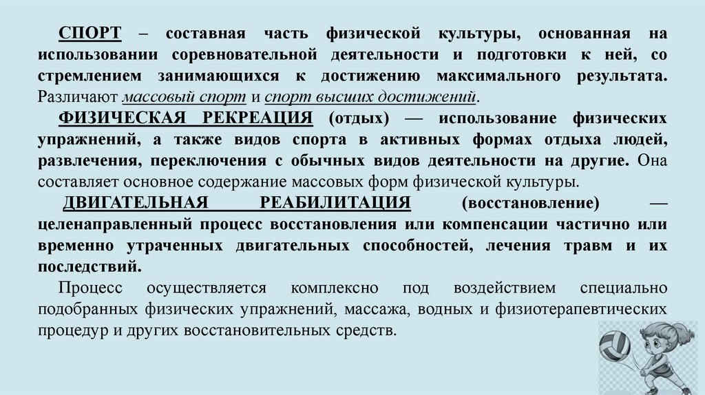«спорт», «физическая рекреация», «двигательная реабилитация»?